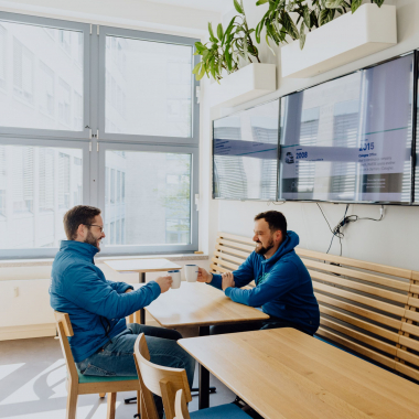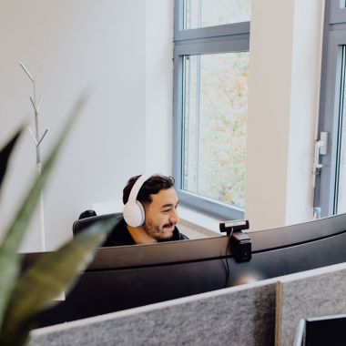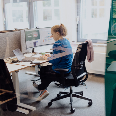 Unsere Open Space Büros sind mit höhenverstellbaren Schreibtischen ausgestattet. Du hast die Wahl zwischen einem Windows oder Mac Notebook für Deine tägliche Arbeit.