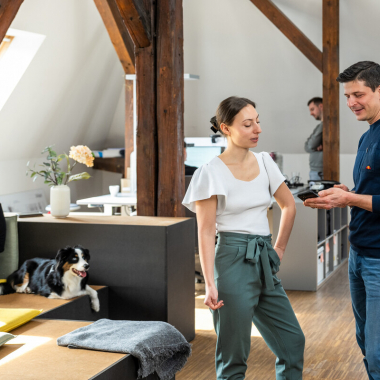 Hund erlaubt: Hunde sind bei uns herzlich willkommen. Natürlich gibt es aber auch Arbeitsplätze ohne tierische Gesellschaft.